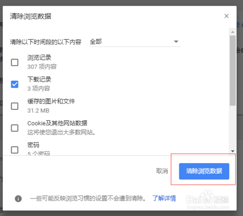 點擊上圖2中的“清除瀏覽數(shù)據(jù)”,瀏覽器將彈出設(shè)置頁面中“清除瀏覽數(shù)據(jù)”的對話框,如下圖所示。