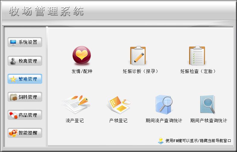 三、繁殖管理:發(fā)情/配種、妊娠診斷(報(bào)孕)、妊娠檢查(定胎)、流產(chǎn)登記、產(chǎn)犢登記、期間流產(chǎn)查詢統(tǒng)計(jì)、期間產(chǎn)犢查詢統(tǒng)計(jì)