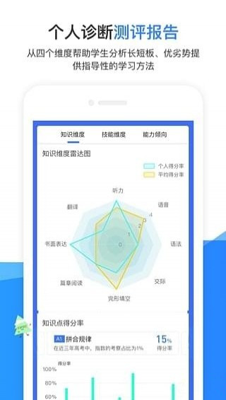 學(xué)業(yè)體檢:即測即評(píng),幫助學(xué)生完成對(duì)自我學(xué)習(xí)的檢測個(gè)人診斷評(píng)測報(bào)告:從四個(gè)維度幫助學(xué)生分析長短板、優(yōu)劣勢提供指導(dǎo)性的學(xué)習(xí)方式