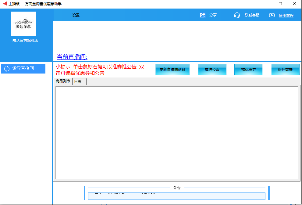 萬(wàn)商堂淘寶直播間神器是為淘寶直播開(kāi)發(fā)的一款小工具。點(diǎn)擊讀取直播間后會(huì)顯示當(dāng)前直播間的所有商品信息,雙擊表格的某一行可以為當(dāng)前商品綁定優(yōu)惠券,公告信息,右鍵單擊表格某一行可以選擇將優(yōu)惠券或公告推送到當(dāng)前直播間,支持隱藏券。