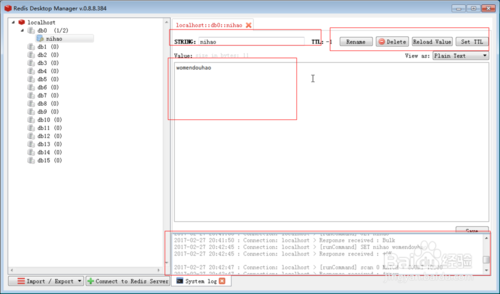 然后你可以雙擊那個(gè)Key(nihao),它會(huì)在右側(cè)的部分將Key 與 Value都展示出來(lái),并且對(duì)Key有一些相應(yīng)的操作。我們也可以在Key上右鍵單擊,彈出的對(duì)話框中依然會(huì)有一些對(duì)應(yīng)操作。