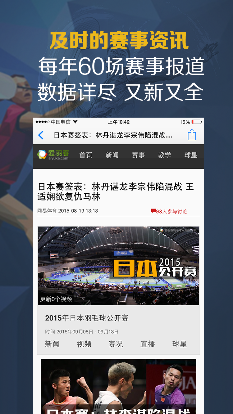 羽毛球愛好者的必備利器,國內(nèi)專業(yè)的愛羽客羽毛球網(wǎng)官方APP??辞颉W球、打球統(tǒng)統(tǒng)搞定!