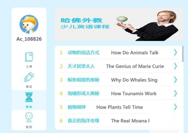 1、精選哈佛外教授課,興趣課程自由選擇,這不僅是英語教學(xué),思維方式、學(xué)科知識并培養(yǎng)英語學(xué)習(xí)習(xí)慣。2、原聲發(fā)音對話練習(xí),智能評分系統(tǒng)準(zhǔn)確評分發(fā)音,創(chuàng)建孩子專屬的英語作品集錦。