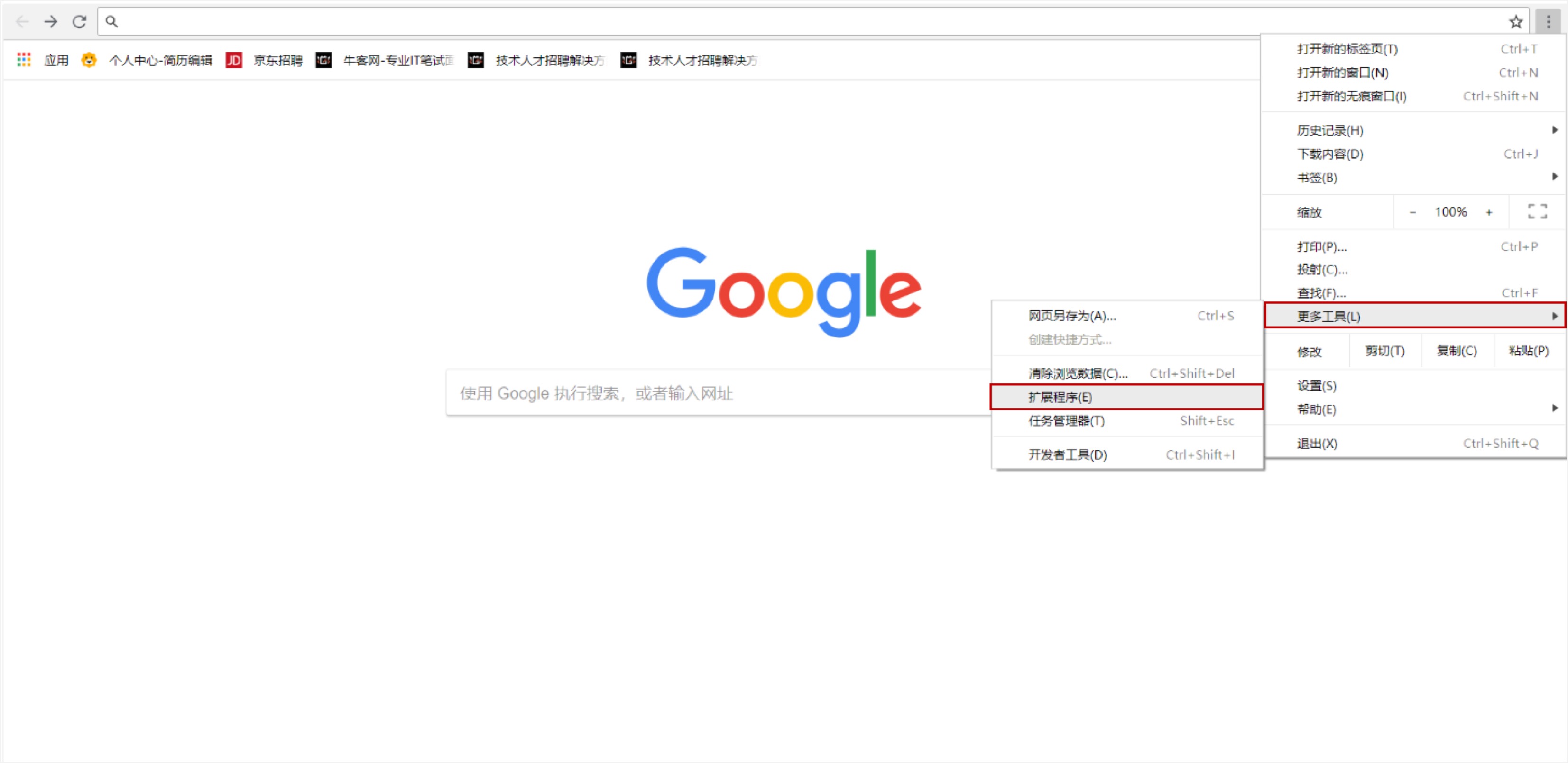2. 打開Chrome瀏覽器,點擊右側(cè)的工具菜單,依次選擇更多工具>擴展程序。