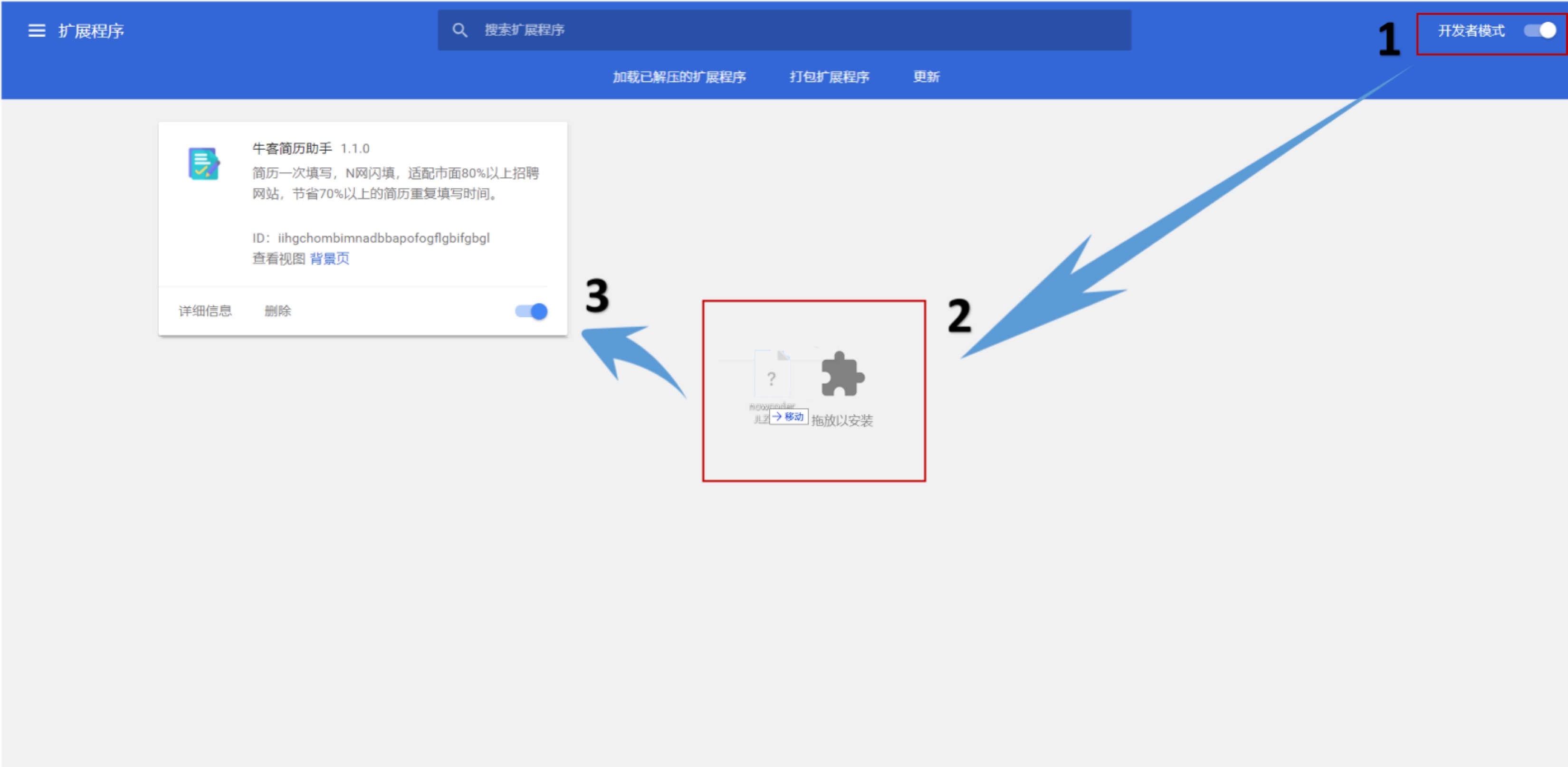 3. 進入擴展程序頁面,開啟右上角的開發(fā)者模式,將步驟一中下載的名為nowcoderJLZS的安裝文件拖拽進頁面即可。