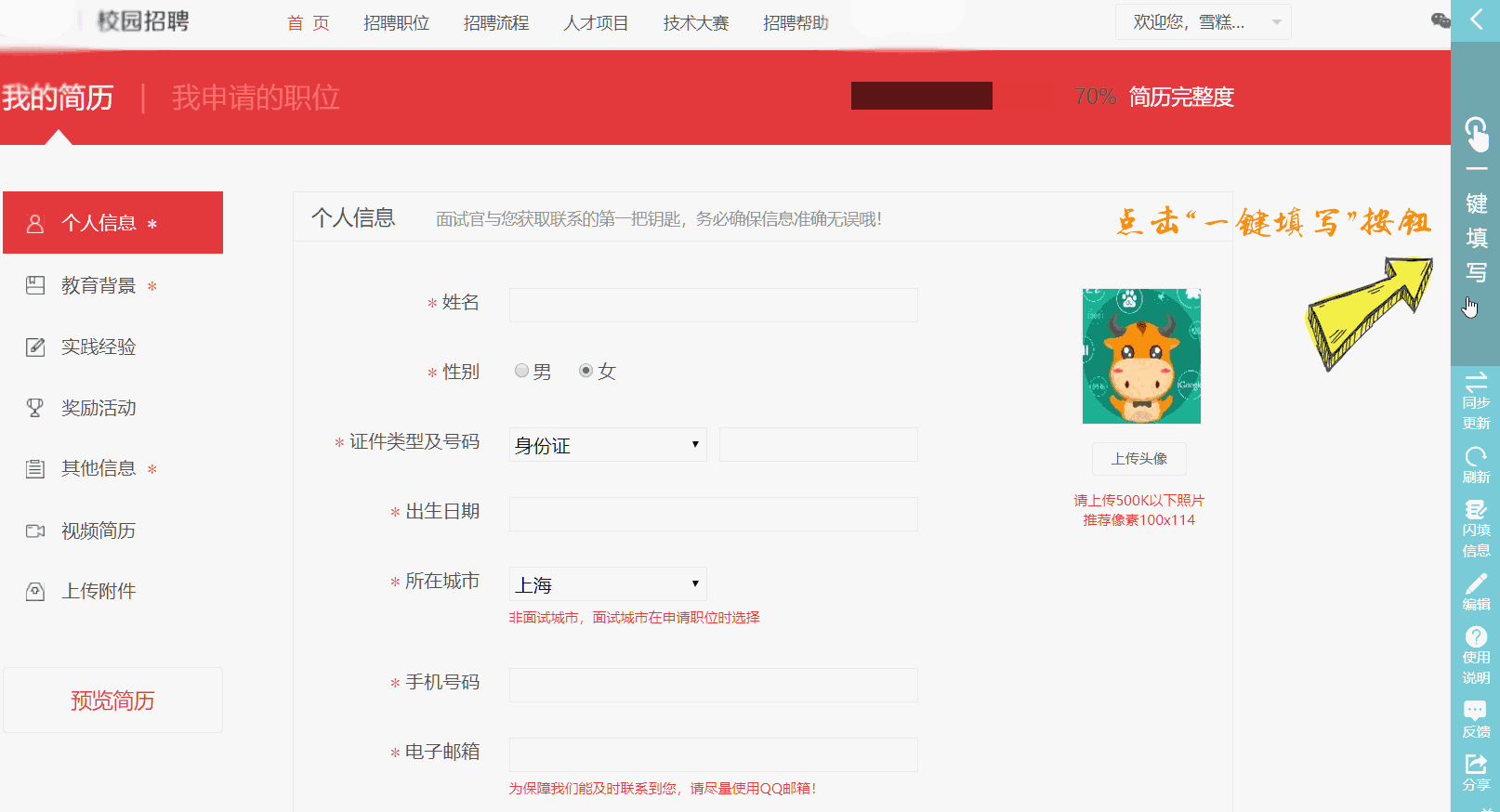 修改后的信息會記錄在“同步信息”中,點擊“同步更新”按鈕~幫助你將頁面修改信息同步至你的閃填信息~下次填寫簡歷就方便多啦~