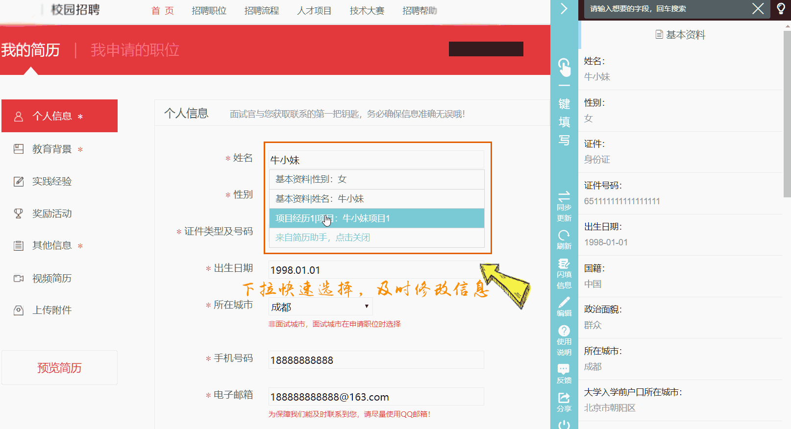 在企業(yè)招聘官網(wǎng)修改的信息,可以即時同步更新到??烷W填助手里