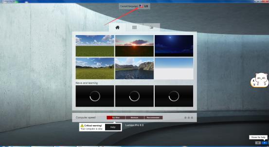 Lumion如何新建場(chǎng)景模型首先,我們開(kāi)啟Lumion,等待Lumion開(kāi)啟后,我們就會(huì)進(jìn)入到Lumion的起始頁(yè)面,在起始頁(yè)面的上方,為語(yǔ)言選擇,點(diǎn)擊即可進(jìn)入到語(yǔ)言設(shè)置頁(yè)面。