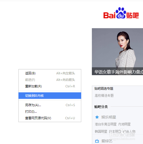 點擊鼠標(biāo)右鍵,然后點擊【切換到IE內(nèi)核】就可以成功切換成兼容模式了。