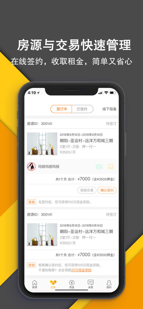1.支持房源與交易管理可自主完成房源的發(fā)布、編輯及下架;提供在線簽約渠道,可在線上一鍵完成簽約,方便快捷;