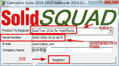然后再到解壓后的軟件包下面,打開“_SolidSQUAD_”文件夾下面的“Camnetics.Suite.2016.LicGen.15092015.SSQ.exe”注冊機,第一個選框選擇“GearTrax 2016 for SolidWorks”,第二個選框宣泄你之前復(fù)制的序列號,然后在第三第四個選框內(nèi)填入你的郵箱和公司名,最后點擊“Register”。