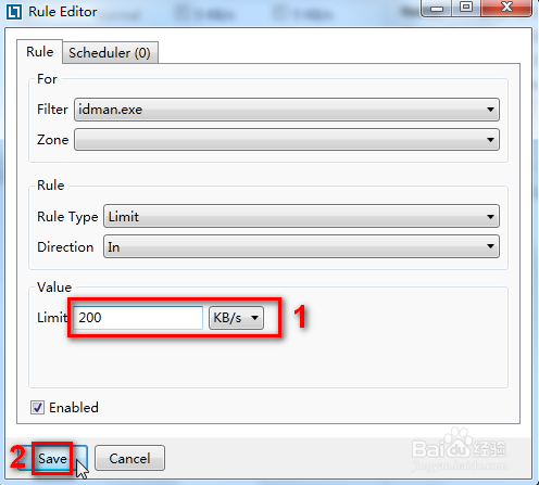3.在Limit右邊設(shè)置為“200”KB/s,點(diǎn)Save按鈕。