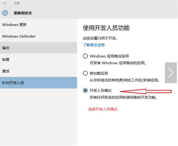 首先選擇開發(fā)人員模式:點擊右下角漢堡萊單——所有設(shè)置——更新和安全——針對開發(fā)人員——選擇開發(fā)人員模式