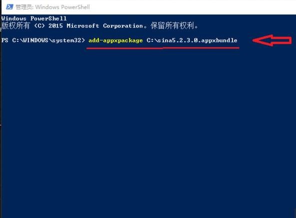 粘貼:add-appxpackage C:\sina5.2.3.0.appxbundle(ctrl+v可以粘貼)然后按Enter即可自行安裝(以其它安裝包為例)