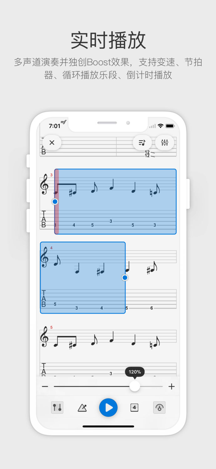 貝殼吉他譜app支持樂譜實(shí)時(shí)播放。除常見的靜音效果、獨(dú)奏效果、音量調(diào)整外,貝殼吉他譜app獨(dú)創(chuàng)Boost增益效果。