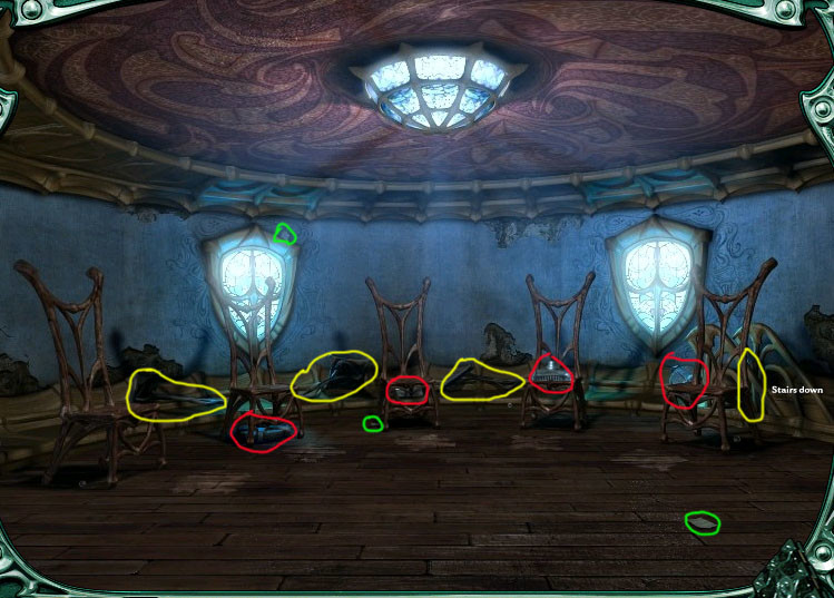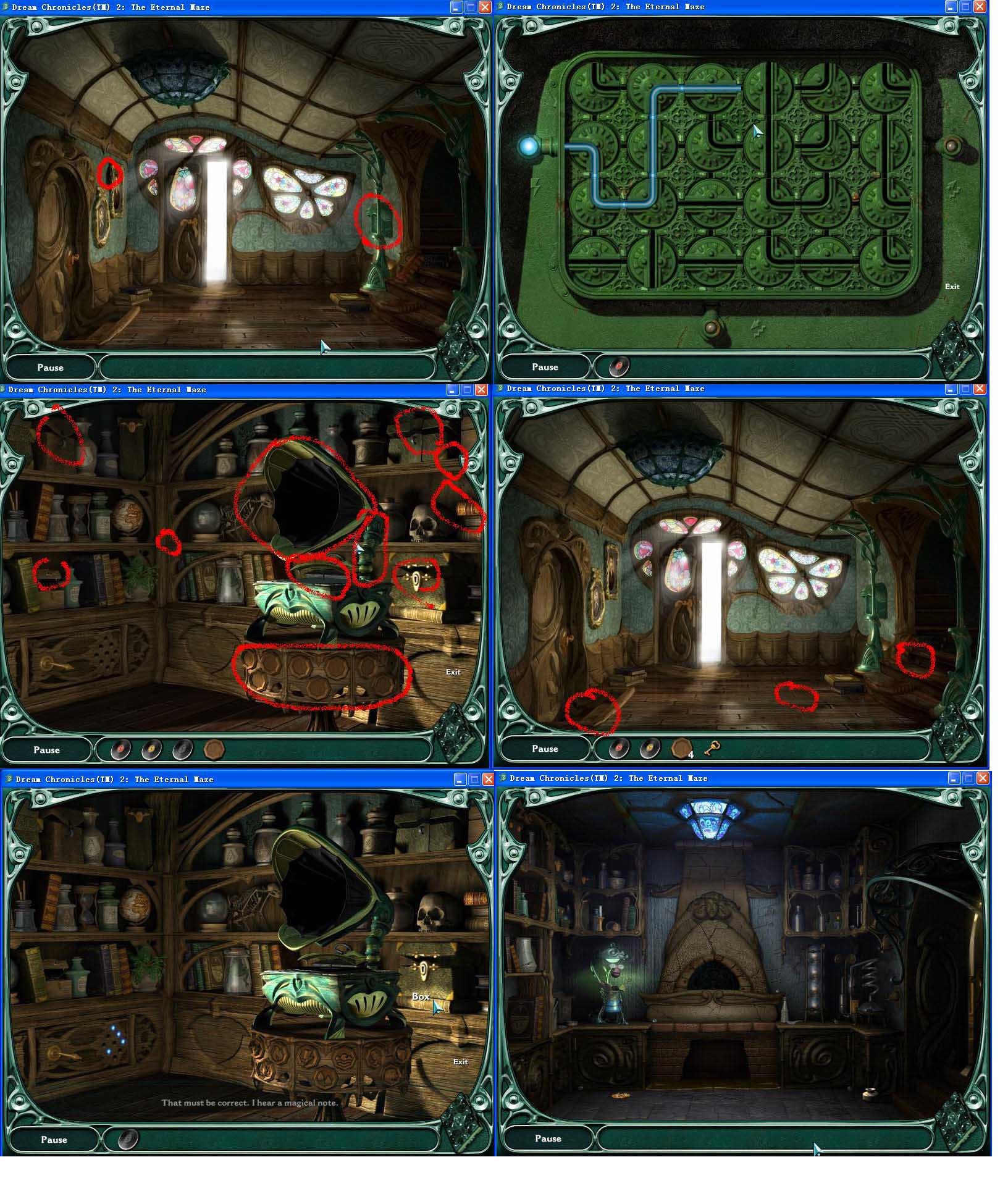 撿東西,然后靠近留聲機,拼裝好留聲機需要9個小圓盤(全部放回原位置后會出現(xiàn)不同圖案),一個喇叭,一個支喇叭的支架,一個放唱片用的劃針(專業(yè)叫啥名字俺不知道哈),在各個屋子里找這些材料,書架上的帶鎖盒子里也有,需要找到鑰匙開。圓盤不好找,鼠標多點點吧。安好機器后,播放找到的三張唱片(一張唱片三種聲效),根據(jù)聽到的聲音按9個圓盤上的對應圖案(鳥,貓,牛,馬,蛙,雨,雷,火,高山流水),打開左下的柜子,拿到實驗室鑰匙,進入實驗室