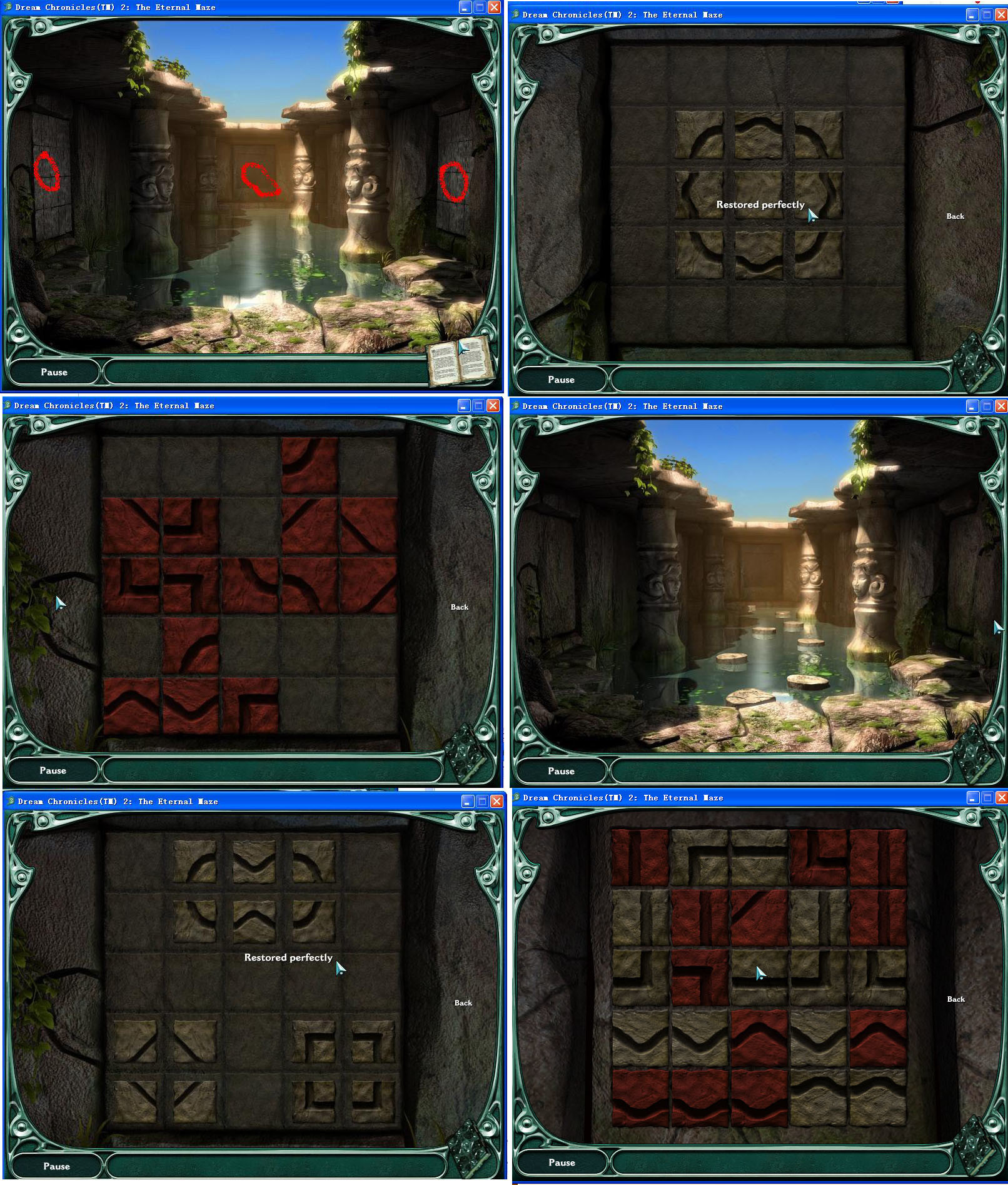 第三關(guān),左右兩個門石塊的圖案被打亂,取下來重新拼,然后水塘里出現(xiàn)多個石頭,選擇正確的路線就可以到中間那個門,錯了可以重選。中間門的圖案隨便點點就可以拼對,汗