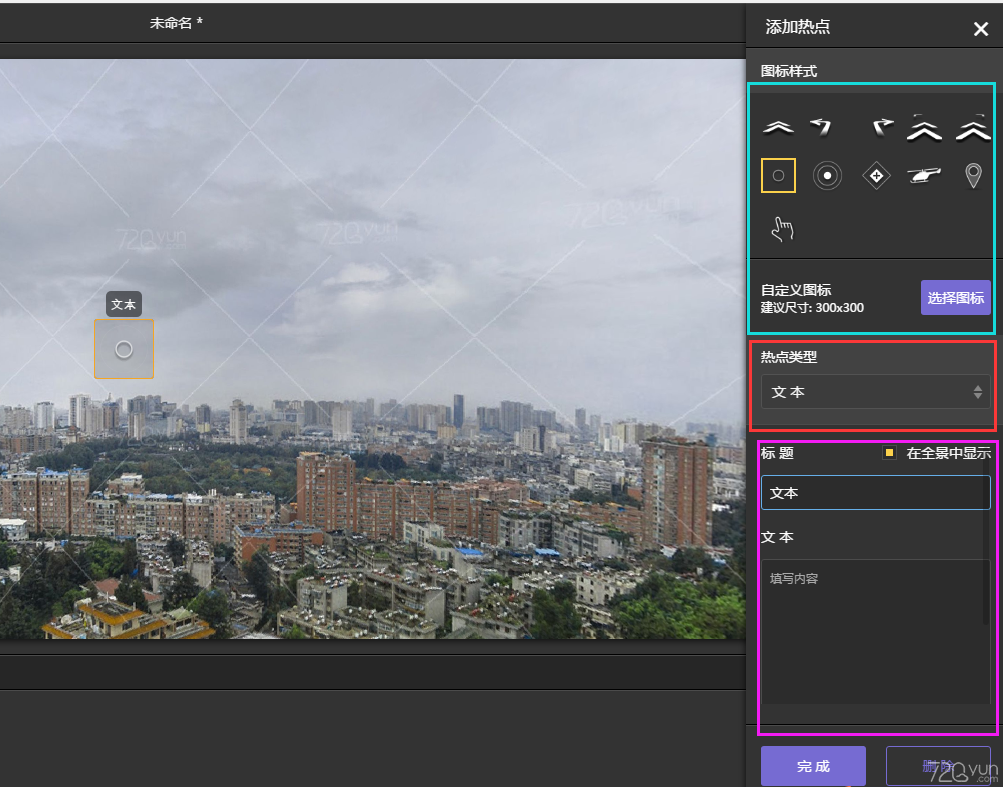 在紫色框處輸入熱點(diǎn)的標(biāo)題,并框選是否顯示熱點(diǎn)的名稱(在全景中顯示選項(xiàng))