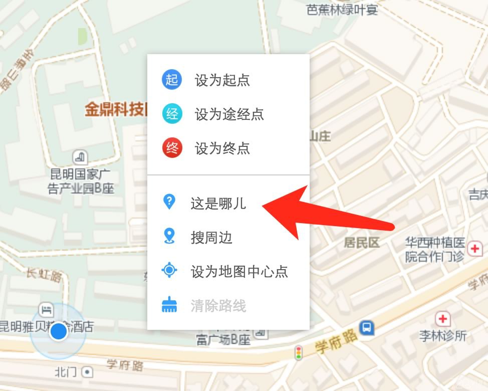 3.點(diǎn)擊鼠標(biāo)右鍵呼出菜單,選擇“這是哪兒”,設(shè)置好以后,會(huì)在地圖中出現(xiàn)一個(gè)紅色圖標(biāo)與地點(diǎn)說(shuō)明