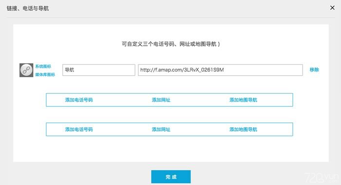 5.轉(zhuǎn)到720yun中,打開作品編輯頁(yè)中的“電話、鏈接與導(dǎo)航”功能,點(diǎn)擊“電話”按鈕,在輸入框中填入剛才復(fù)制的那串地址,點(diǎn)擊“完成”按鈕即可完成相關(guān)設(shè)置。(網(wǎng)站與桌面客戶端通用)。