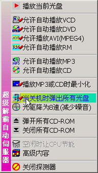 盡管在Windows的資源管理器中可以右擊光盤,并選擇"彈出"命令,將光驅(qū)中的光盤彈出(如圖3),但是卻沒有一個"進(jìn)倉"命令關(guān)上CD盒,這不得不說是Windows的一個Bug.不過,筆者在使用超級解霸自動伺服器的過程中發(fā)現(xiàn),它可以起到一個CDROM驅(qū)動器的軟件開關(guān)作用.具體的方法是:安裝完《超級解霸》后,右擊任務(wù)欄上的系統(tǒng)伺服器圖標(biāo),在彈出如圖4所示的菜單中選擇"彈開所有CD-ROM"命令,就可以將本機上的所有CD-ROM(不包括刻錄光驅(qū)CD-RW等設(shè)備)的光驅(qū)盒蓋打開,供您進(jìn)盤,如果您要關(guān)閉盒蓋,只要再次選擇"關(guān)閉所有CD-ROM"菜單即可.這樣使用起來一來比較方便,二來減少了硬件的損壞,真是一舉兩得.