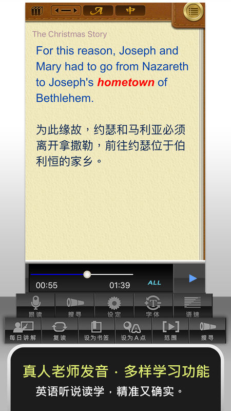 13.提供全文閱讀設(shè)定,可根據(jù)需求設(shè)定單句或全文閱聽。
