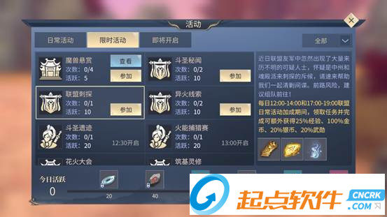 聯(lián)盟刺探活動每天10:00-23:59均可參與,完成聯(lián)盟刺探任務(wù)不僅可以獲得大量經(jīng)驗,還能獲得金魔晶、武勛以及交換火焰用的白日煙火和10點活躍度。