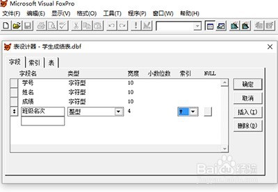 在彈出的“表設(shè)計器”中,選擇“字段”選項,輸入字段名,設(shè)置字符類型、寬度、排序方式