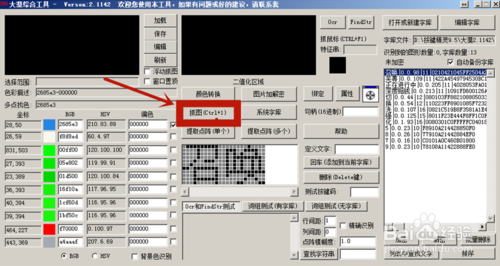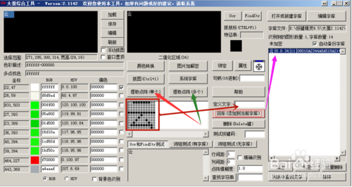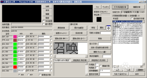 11、點(diǎn)中字體中顏色后,你想抓的字就顯示二值化區(qū),而且還有記錄字體的顏色值和坐標(biāo)!如圖