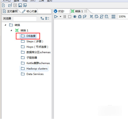 新建轉(zhuǎn)換后在左邊的主對象樹中建立DB連接用以連接數(shù)據(jù)庫。如圖所示: