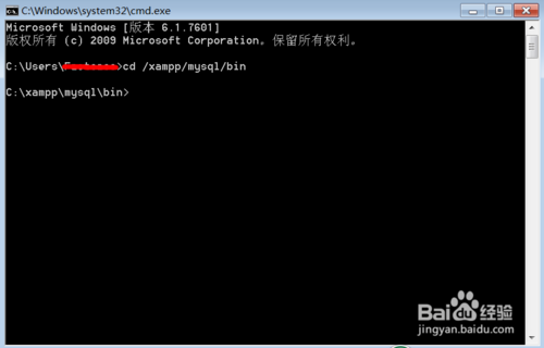 這時會看到如下圖,輸入命令'cd /xampp/mysql/bin' 回車