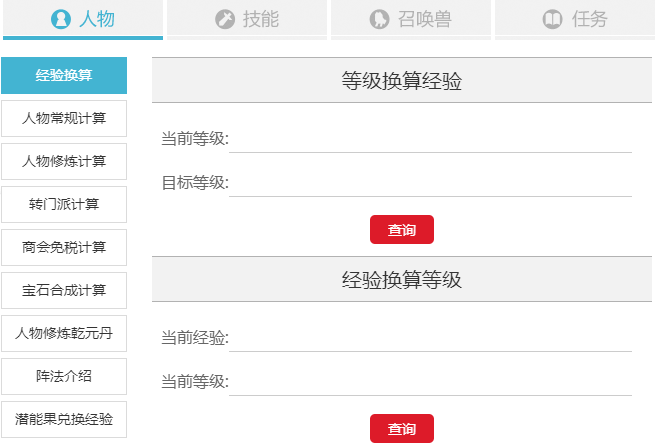 技能換算:師門技能計算、幫派技能計算、三級藥表、家具配方、烹飪表、法寶大全、法寶吸收靈氣地點、符石組合、靈飾屬性、乾元丹消耗計算、裝備特技
