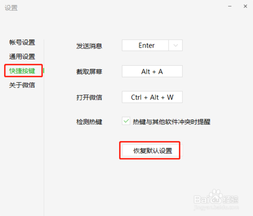 5、點擊左側(cè)快捷按鍵,可以設(shè)置發(fā)送消息、屏幕截取、打開微信的快捷鍵,并且可以恢復(fù)默認(rèn)設(shè)置。