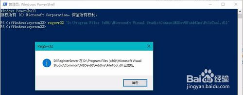 鼠標(biāo)右鍵點(diǎn)擊桌面左下角"開(kāi)始"選擇"Windows Powershell(管理員)(A)",復(fù)制下面代碼(去掉32前面的空格):regsvr 32 "D:\Program Files (x86)\Microsoft Visual Studio\Common\MSDev98\AddIns\FileTool.dll"