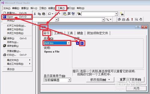 “定制”面板-“命令”- 選“Add-ins”,從右側(cè)將新的“O”圖標(biāo)拖動(dòng)至原來(lái)“打開(kāi)”的位置,添加新的“打開(kāi)”,如圖所示。完成后VC++6.0即可正常編譯并運(yùn)行。