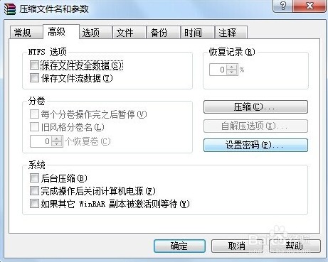 3、在“高級選項卡”里,選擇“設置密碼”按鈕,打開密碼設置頁面,進行設置密碼。設置完成后,點擊確定,進行文件壓縮。