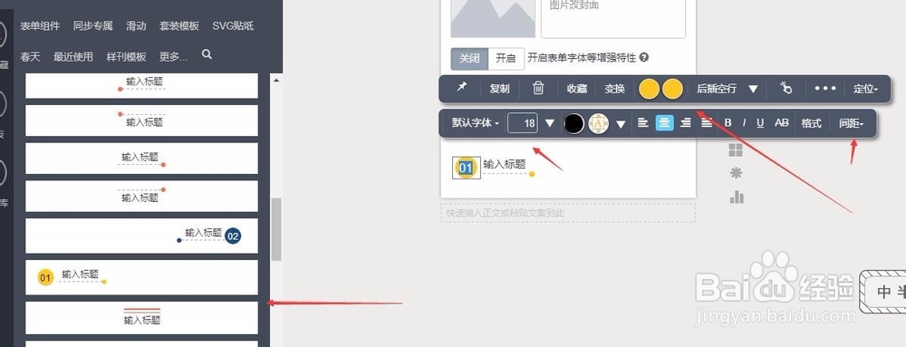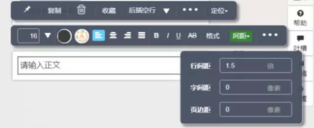 以標題系統(tǒng)模板的正文輸入模板為例,向編輯區(qū)添加“請輸入正文”模板,在編輯區(qū)點擊該模板選中,就會出現(xiàn)對應(yīng)的工具箱。