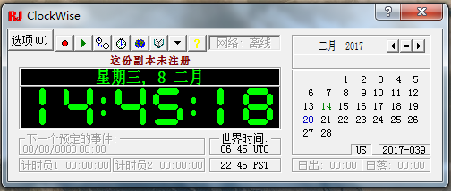 ClockWise是一個(gè)結(jié)合了數(shù)字時(shí)鐘、日歷、提醒/備忘時(shí)鐘、計(jì)時(shí)和程序調(diào)度的時(shí)間管理實(shí)用工具,它可以安排5個(gè)提醒和多達(dá)30個(gè)單獨(dú)的程序事件,另外,它還可以通過Inter net或原子鐘自動(dòng)設(shè)置系統(tǒng)時(shí)間。你可以用它自動(dòng)安排關(guān)機(jī)和重新啟動(dòng)的時(shí)間。