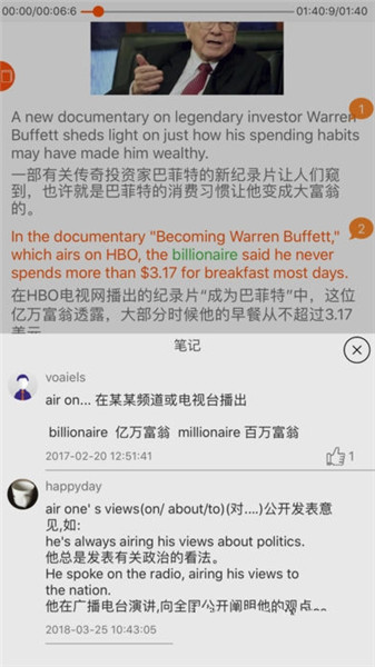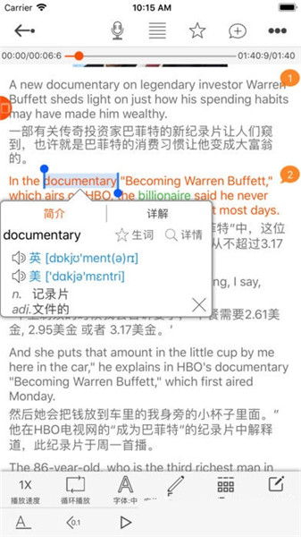 4.課文界面任意設(shè)置復(fù)讀區(qū)域,進(jìn)/退精確到0.1秒,便于精確到單詞甚至音節(jié)的聽寫,辨別自己的發(fā)音是否準(zhǔn)確。英語(yǔ)句子即點(diǎn)即讀,聽寫過程中定位高亮顯示。