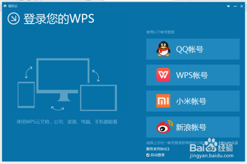 您可以選擇多種登錄方式,小編以QQ帳號為例介紹登錄使用wps云存儲的功能。點擊“QQ帳號”,選項,如圖所示