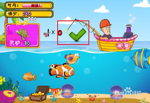 3、水下會有各種魚游過,根據(jù)目標任務(wù),必須要找到目標魚才放下鉤子釣上來才可以得分的哦,否則就要減分。