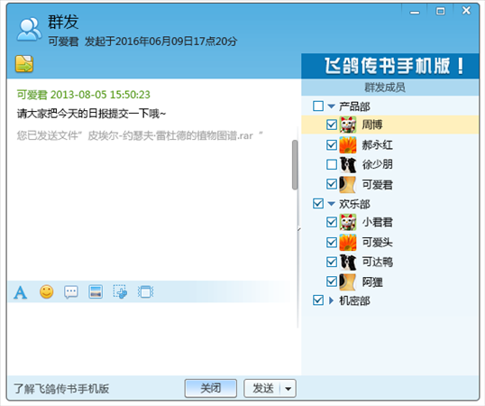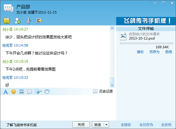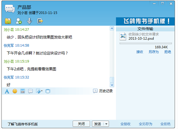 討論組模塊也在飛鴿傳書2014版中做了很多改進,已經(jīng)完全支持討論組的消息和文件收發(fā),并且可以隨時查看消息和文件的收發(fā)記錄。
