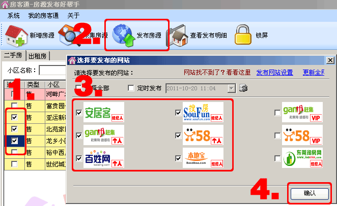打開單多多軟件后,選擇您要發(fā)布的房源后,點(diǎn)擊發(fā)布按鈕,選擇相關(guān)發(fā)布的網(wǎng)站,點(diǎn)擊確認(rèn)就可以了,詳情見下圖