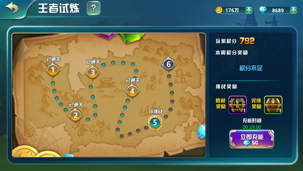 在王者試煉中殿下每關(guān)擁有99點點血量,根據(jù)關(guān)卡結(jié)束時的剩余血量結(jié)算積分,每周高積分發(fā)放SS碎片大寶箱,每關(guān)也有單獨的通關(guān)寶箱發(fā)放,英雄碎片的主要產(chǎn)地。