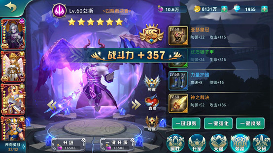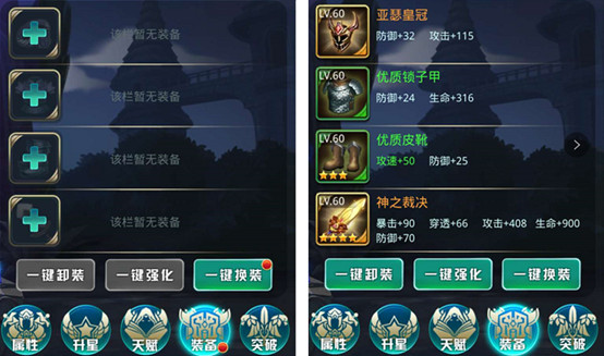 玩家大大們會根據(jù)不同的副本,不同的怪物進行排兵布陣,如果遇到通關(guān)困難,可以嘗試“一鍵卸裝”“一鍵換裝”按鈕進行英雄之間的裝備調(diào)整,屬性最大化,勁往一處使,才是通關(guān)王道。