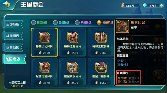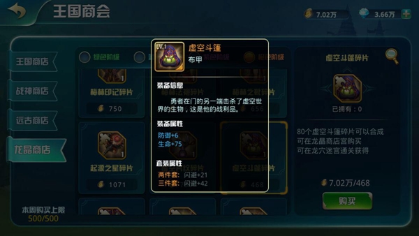 龍晶幣可購買綠色階級裝備碎片、藍色階級裝備碎片(龍穴迷宮通過10層可購買)、紫色階級裝備碎片(龍穴迷宮通過20層可購買)、橙色階級裝備碎片(龍穴迷宮通過30層可購買);藍色階級以上的裝備,擁有套裝屬性哦!