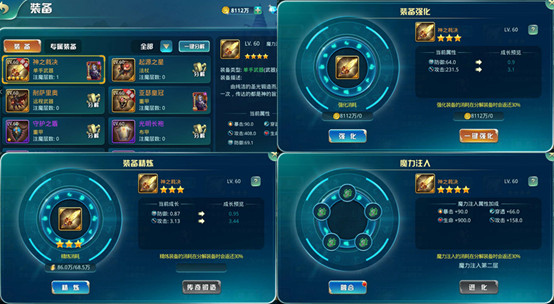 強化:消耗金幣進行裝備強化,可以提升裝備等級,一鍵強化自動升到最高等級