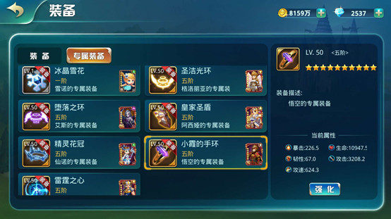 強化:消耗專屬精華和專屬裝備碎片,提高裝備專屬屬性,最高為5階,每階有10星