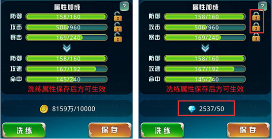 精煉:消耗金幣和鉆石,提高屬性加成,3階開啟第二屬性洗練,5階開啟第三屬性洗練,鎖定其中一個屬性,則需要消耗鉆石。