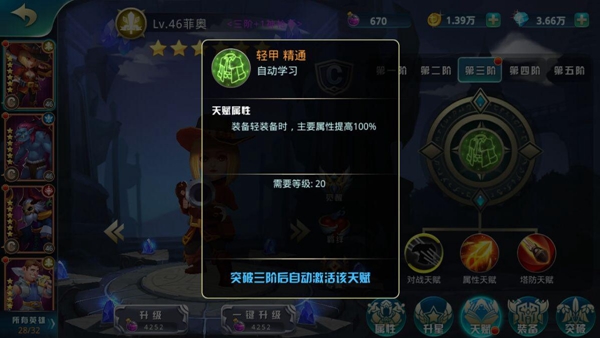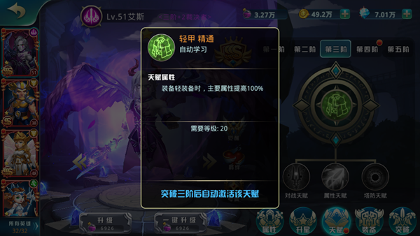 每個英雄都有自己的裝備專精,在20級天賦突破三階后自動激活,就算沒有20級,也可以在英雄界面查看,增加100%的主屬性哦~